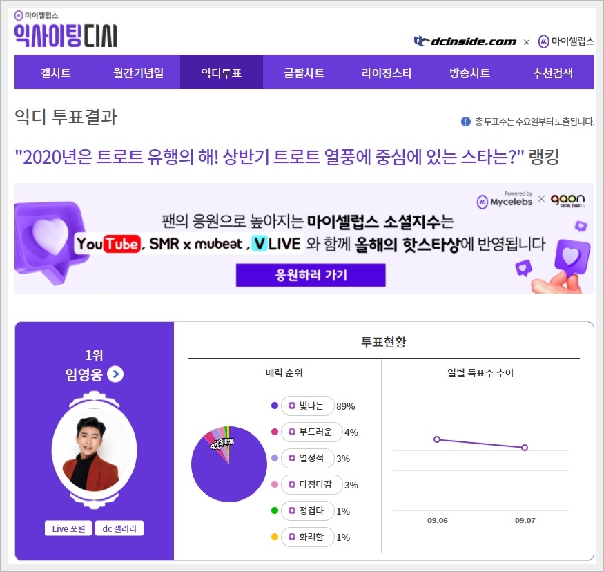 2020년 9월 6일부터 2020년 9월 12일까지 마이셀렙스 익사이팅 디시에서 투표가 진행중입니다. 이번 질문은 2020년은 트로트 유행의 해! 상반기 트로트 열풍에 중심에 있는 스타는? 이라는 주제를 가지고 현재 익사이팅 디시에서 익디투표를 진행중에 있습니다. 익사이팅 디시를 줄여서 익디투표라고 합니다. 현재 투표결과는 1위 임영웅 51,752표로 1위를 달리고 있으며, 2위는 이찬원 13,981표, 3위는 영탁 2,924표, 4위는 송가인 156표를 달리고 있습니다. 익사이팅 디시에서 투표를 진행해야 하는 이유는 연말 가온챠트 뮤직어워즈의 올해의 소셜 핫 스타상에 반영되는 투표이기 때문입니다. 아래에 이미지로 차근 차근 아주 쉽게 설명해 드리겠습니다. 익사이팅 투표 하는 방법과 꿀팁도 하나 더 알려드리겠습니다. 천천히 따라해 보세요.