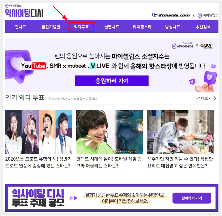 익사이팅 투표를 하기 위해서는 우선 익사이팅 디시 홈페이지로 들어가셔야 합니다. 아래 바로가기 링크 올려드리겠습니다. 그곳으로 들어가셔서 상단 메뉴에 보시면 익디 투표가 있습니다. 오늘 투표를 해야 할 건 2020년은 트로트 유행의 해! 상반기 트로트 열풍에 중심에 있는 스타는? 에 투표를 진행하시면 됩니다.