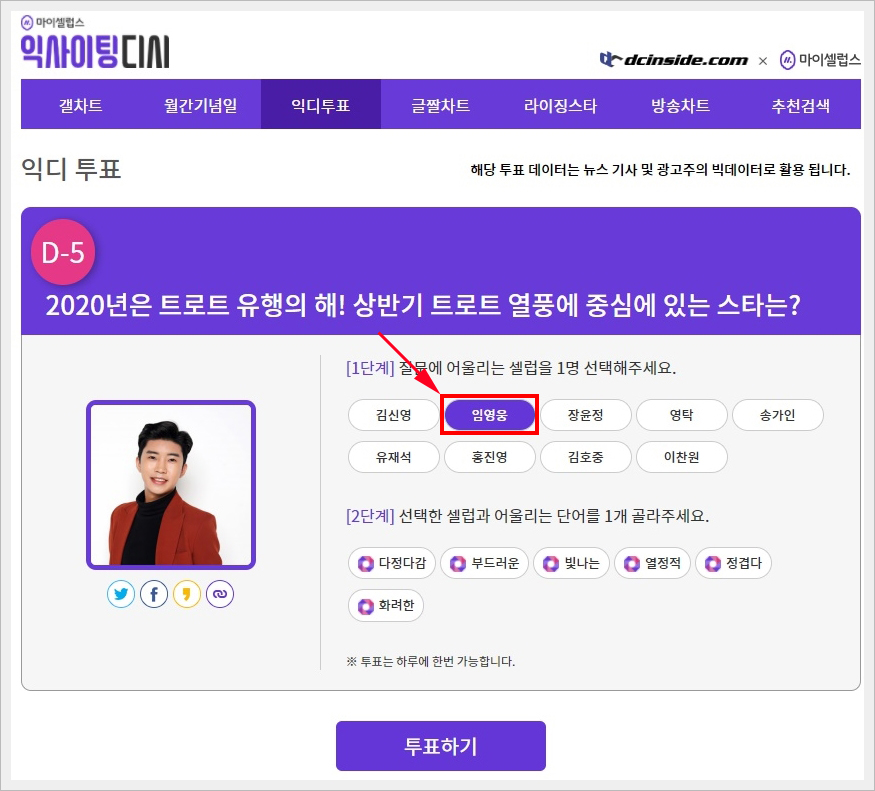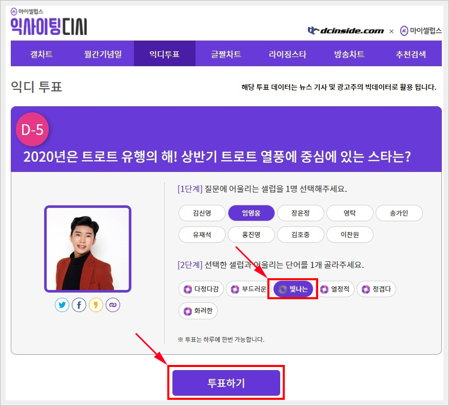 2020년은 트로트 유행의 해! 상반기 트로트 열풍에 중심에 있는 스타는? 에 들어가시면 투표를 진행할수 있는 후보들이 있습니다. 그중에서 자신이 원하는 스타를 1단계에서 먼저 선택하신 다음, 2단계에서 어울리는 단어를 선택하시면 됩니다. 참고로 저는 1단계에서 임영웅을 선택하고, 2단계에서 빛나는 을 선택했습니다. 그렇게 선택을 마치셨으면 하단에 보시면 투표하기 버튼이 있습니다. 그걸 눌러주시면 투표가 끝납니다. 어렵지 않으시지요? 이렇게만 하면 자신이 사랑하는 스타에게 소중한 한표를 행사하시는 겁니다.