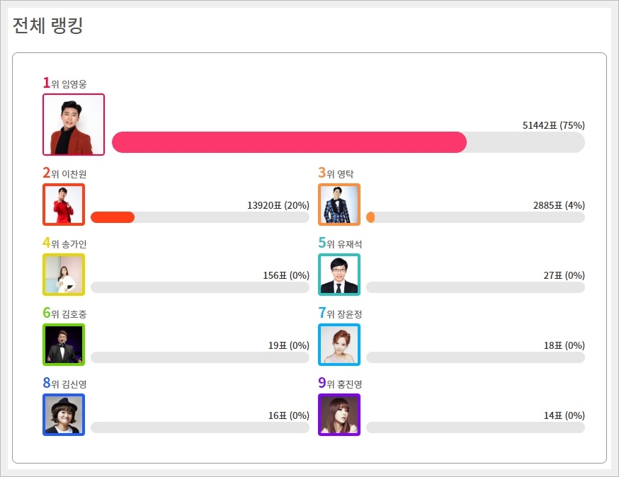 투표를 완료하시면 아래처럼 투표 결과도 보실수 있습니다. 1위 임영웅의 빛나는이 89%로 가장 높습니다. 역시 제가 생각하는 단어와 아주 잘 어울렸습니다. 현재 전체 랭킹을 보면 1위 임영웅, 2위 이찬원, 3위 영탁, 4위 송가인의 순서 입니다. 무난하게 우리의 히어로가 1위를 할것 같습니다.