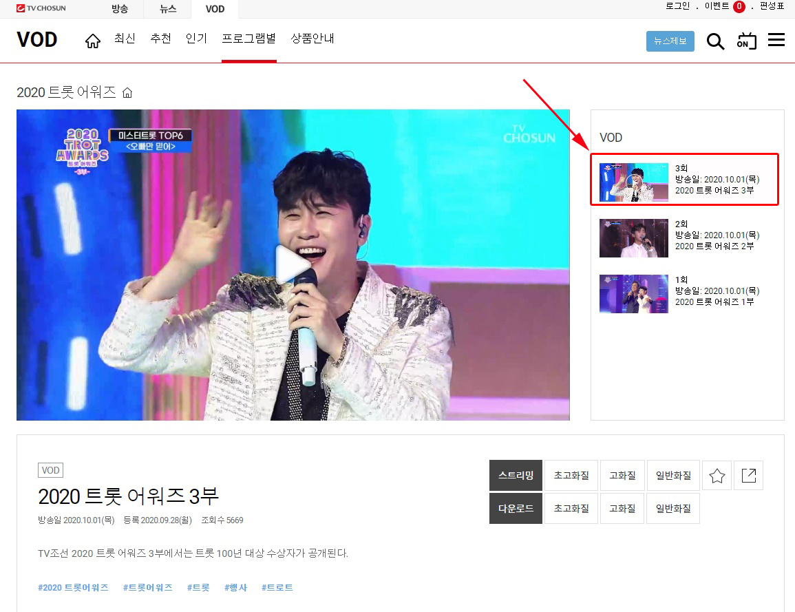 2020 트롯어워즈의 시청률은 무려 22%가 나왔습니다. 정규방송이 아닌 케이블채널인데도, 방송률이 22%가 나왔다는건 정말이지 대단한 방송이라고밖에 할수 없습니다. 2020 트롯어워즈 1회의 대상은 이미자 선생님이 받으셨고요. 우리의 히어로 임영웅은 6관왕이라는 타이틀을 차지했습니다. 정말이지 히어로의 인기는 정말이지 어마무시하다고밖에 말할수 없습니다. 하지만, 멋진건 멋진게 맞습니다. 여자인기상은 송가인이 수상을 했지만, 무슨일이 있어서 불참을 했다고 합니다. 대한민국의 내노라하는 대표 트로트 가수들이 총출동했던 2020 트롯어워즈는 성황리에 방송을 마쳤습니다. 시국이 시국인지라, 무관중으로 방송을 진행한것이 두고두고 아쉬울것도 같습니다. 하지만 이것 또한 내년에는 더없는 추억으로 자리 잡을지도 모릅니다. 10월 1일날 방송된 트롯어워즈는 TV조선에서 종종 무료로 재방송을 해주고 있지만, 시간을 맞추기가 조금은 어렵습니다. 2020 트롯어워즈의 재방송은 유료로 인터넷으로 시청을 하실수 있습니다. 단돈 1,000원이면 다운로드 까지 모두 됩니다. 방송 편성을 1부,2부,3부로 나누어 놓았습니다. 3부까지 시청하실려면 3,000원이면 모든 시청이 가능합니다. 다운로드 받아놓으시면 언제든지 시청이 가능합니다. 아래에서 재방송 시청하는 방법을 알려드리겠습니다.