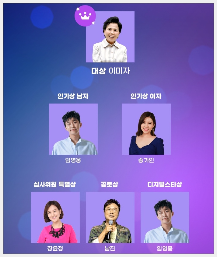 우선 대상은 이미자 선생님께서 수상하셨습니다. 충분히 받아 마땅하신 이미자 선생님이십니다. 인기상 남자는 히어로 임영웅, 인기상 여자부문은 송가인, 심사위원 특별상은 장윤정, 공로상은 남진 선생님, 디지털 스타상은 히어로 임영웅, 가왕상은 송대관, 현철, 태진아, 김연자, 김수희, 하춘화, 남진, 설운도, 나훈아, 주현미, 장윤정이 수상하였습니다.