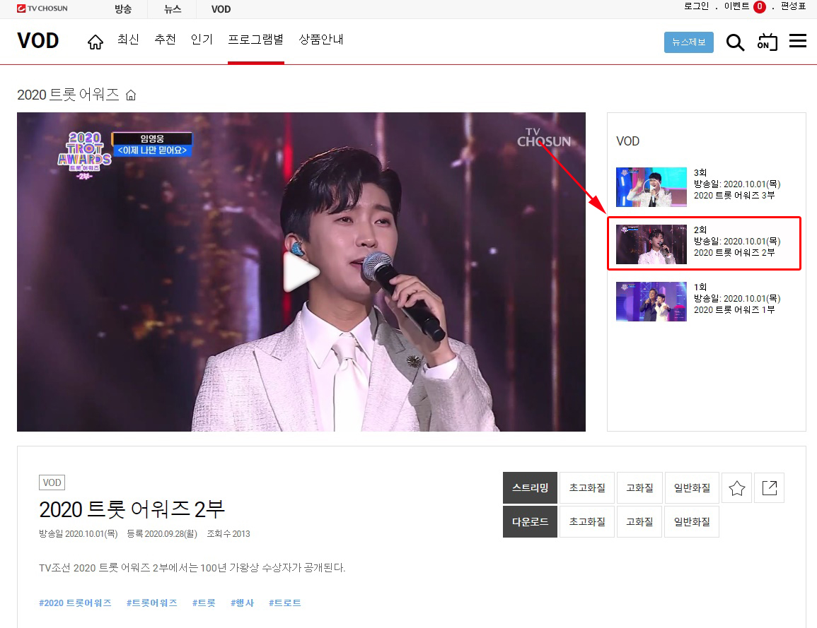 트롯어워즈 재방송을 보고 싶으시다면 우선 TV조선 홈페이지에서 2020 트롯어워즈 방송으로 들어가셔야 합니다. 지금은 방송이 종료되었기 때문에, 검색으로 찾아 들어가셔야 합니다. 아래 링크 따라가시면 홈페이지로 바로 이동합니다.
