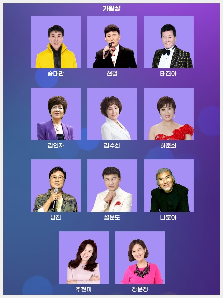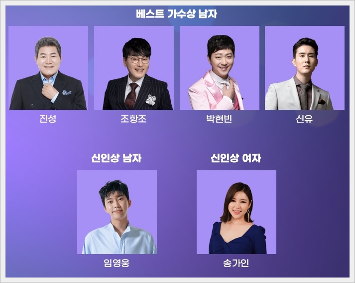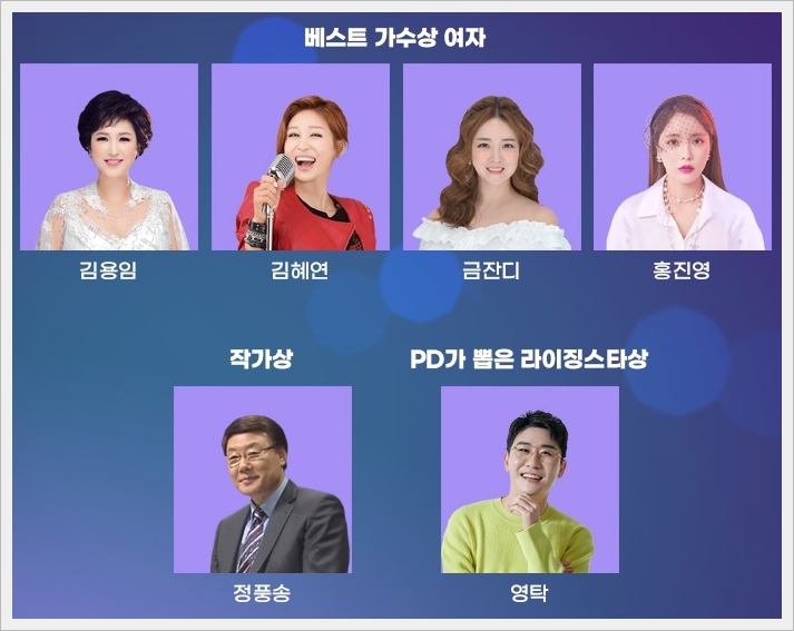 베스트 가수상 여자 부문은 김용임, 김혜연, 금잔디, 홍진영이 수상하였고, 작가상은 정풍송 선생님이, PD가 뽑은 라이징 스타상은 제로탁 영탁이 수상하였습니다. 베스트 가수상 남자 부문은 진성, 조항조, 박현진, 신유가 수상하였고, 신인상 남자 부분은 히어로가, 신인상 여자부분은 송가인이 수상하였습니다.