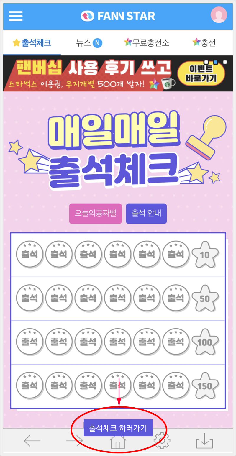 자 이제 투표를 진행할 수 있습니다. 다만, 투표를 진행하려면 별이 있어야 합니다. 하트가 없으면 투표를 진행할 수 없습니다. 하트를 충전하기 위해서는 팬앤스타 오른쪽 상단에 보시면 🙍♂️ 요렇게 생긴 자신의 로그인 페이지로 이동할 수 있는 아이콘이 있습니다. 그 아이콘으로 들어가시면 별 충전할 수 있는 메뉴가 나옵니다. 그러시면 거기에서 별을 충전하시면 됩니다. 출석 체크만 잘하셔도 별 충전이 가능합니다. 아래 오른쪽 세 번째 사진 보시면 출석 체크 있습니다. 거기로 들어가시면 됩니다.