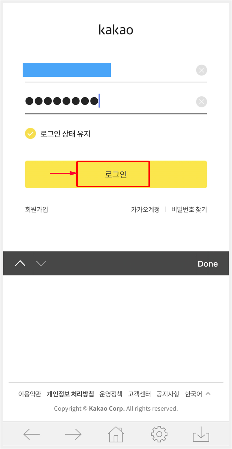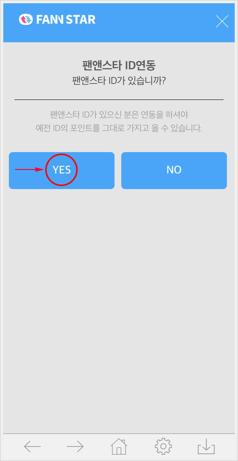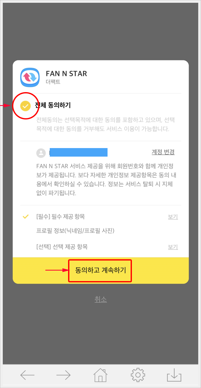 3️⃣ 카카오를 선택하시면 자신의 아이디와 패스워드 입력창이 나옵니다. 그러면 입력하시면 되고요. 그다음 로그인 버튼을 누르시면 됩니다. 다음 화면에서 4️⃣ 전체 동의하기 체크하시고요. 아래 동의하고 계속하기 누르시면 됩니다. 그러면 다음 페이지 5️⃣ 팬앤스타 ID연동 팬앤스타 ID가 있습니까? 이렇게 나오는데요. 여기에서 YES 누르시면 됩니다. 여기까지가 1차로 회원가입을 하셨다고 생각하시면 됩니다.
