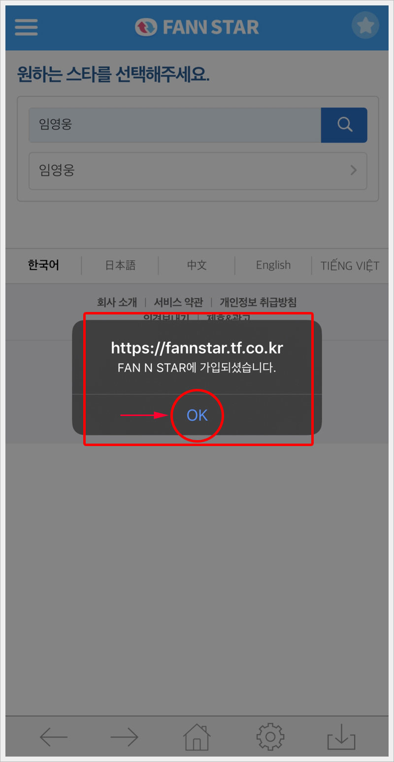 위에서 OK를 누르시면 아래 첫 번째 화면이 나옵니다. 9️⃣ 원하는 스타를 선택해 주세요.라고요. 그러면 자신이 좋아하는 스타를 적으시면 됩니다. 저는 임영웅을 적었습니다. 임영웅 선택하시겠습니까? OK 하시면 되고요. 그러시면 진짜 모두 끝났습니다. 🔟 FAN N STAR에 가입되셨습니다. 여기까지 완료하셔야지만, 이제부터 정상적으로 투표를 진행할 수 있습니다. 회원가입 부분이 어찌 보면 까다로운데요. 그만큼 심사에 공정을 기한다는 의미로 생각하시면 될 것 같습니다. 웨이보의 계정 등록은 현재 중단되었습니다. 정말이지 많은 팬들의 투표 열기를 보여주는 대목이기도 합니다. 아무튼 이렇게 회원가입을 하셔야지만 팬앤스타에서 투표를 진행하실 수 있습니다.