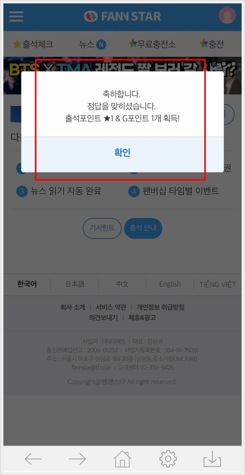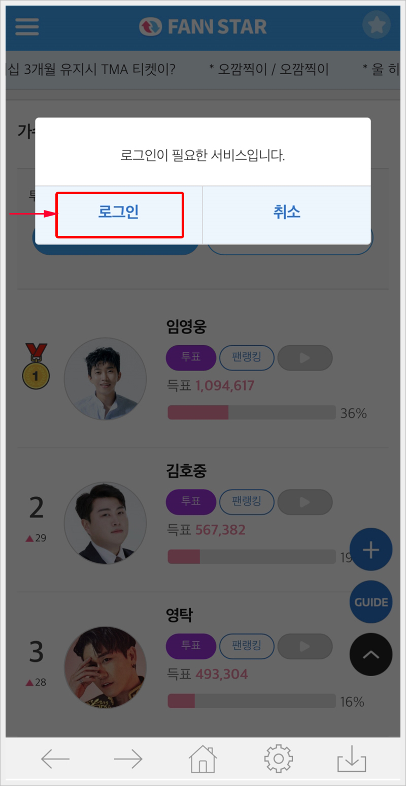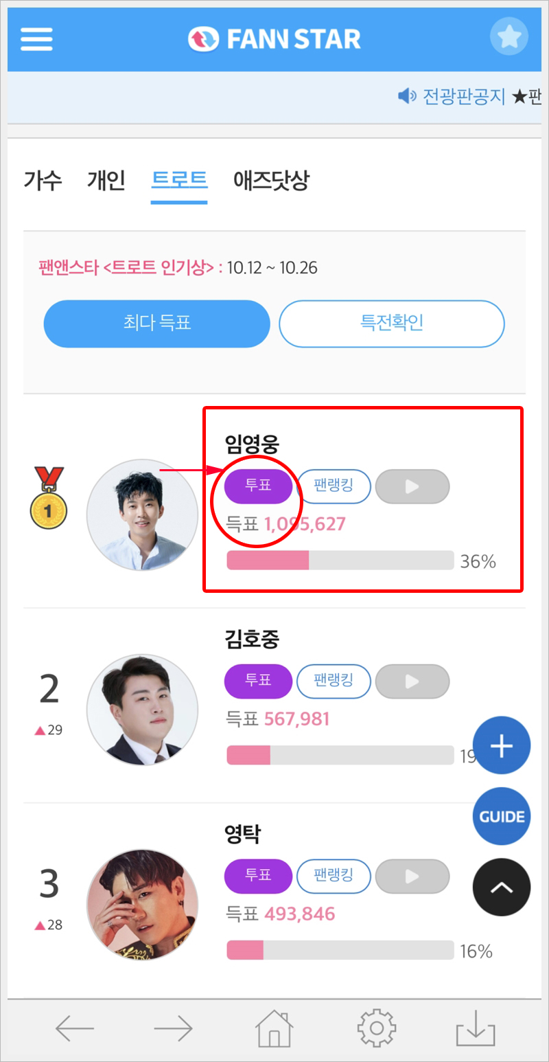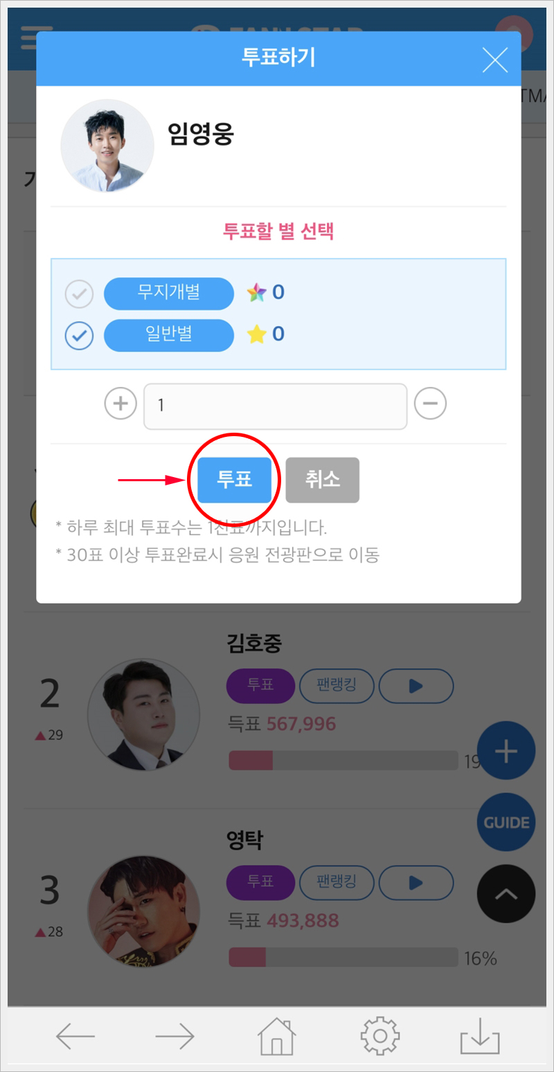팬앤스타 투표 방법 2. 투표와 하트 충전