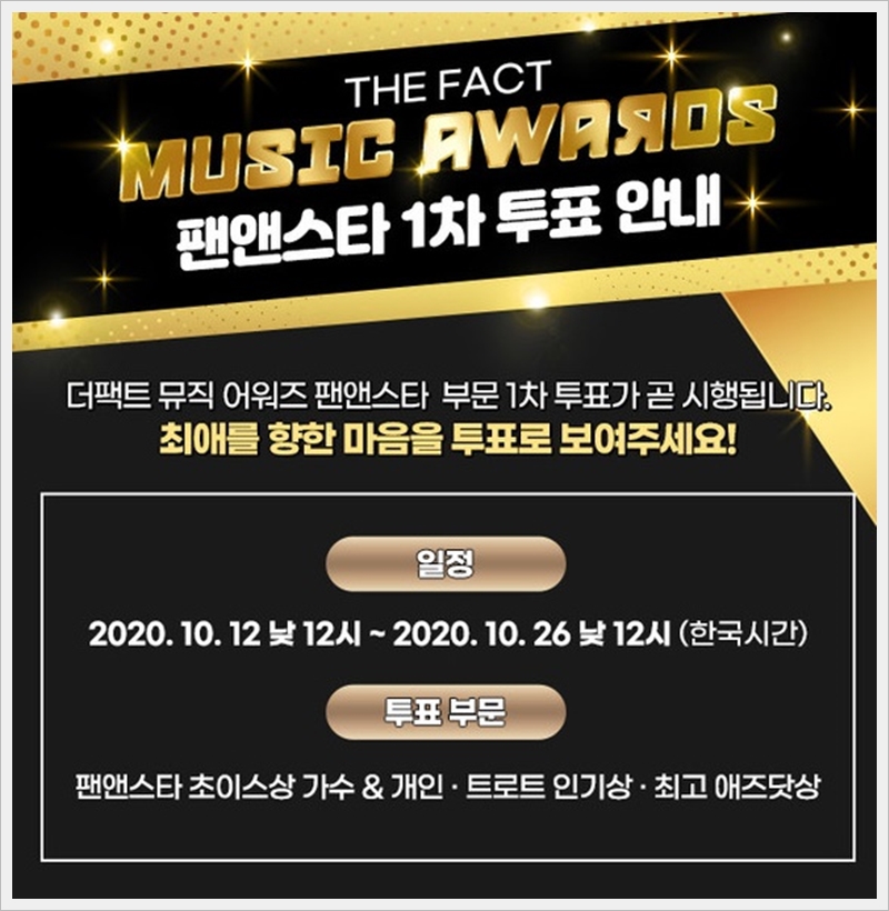 THE FACT MUSIC AWARDS 팬앤스타 1차 투표 일정은 2020년 10월 12일 낮 12시부터 2020년 10월 26일 낮 12시(한국시간)까지 1차 투표가 진행됩니다. 1차 투표에서 20위 권에 들면 2차 투표를 진행하여 최고 투표자에게 팬앤스타 초이스상 가수 & 개인. 트로트 인기상. 최고 애즈닷상을 수여합니다. 1차 투표에서 결정되는 최고 애즈닷상은 1차 투표에서 결정됩니다.