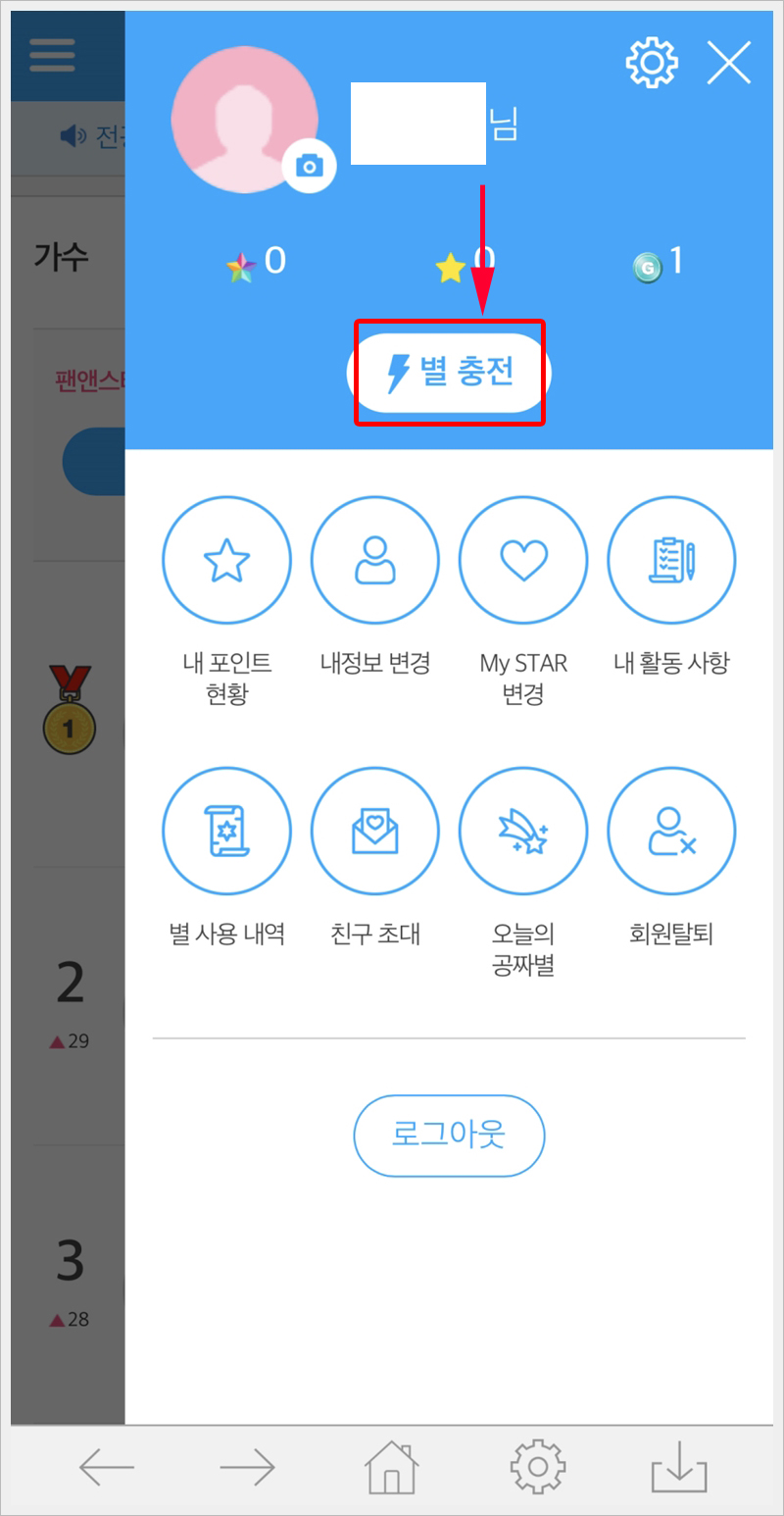 자 이제 투표를 진행할 수 있습니다. 다만, 투표를 진행하려면 별이 있어야 합니다. 하트가 없으면 투표를 진행할 수 없습니다. 하트를 충전하기 위해서는 팬앤스타 오른쪽 상단에 보시면 🙍‍♂️ 요렇게 생긴 자신의 로그인 페이지로 이동할 수 있는 아이콘이 있습니다. 그 아이콘으로 들어가시면 별 충전할 수 있는 메뉴가 나옵니다. 그러시면 거기에서 별을 충전하시면 됩니다. 출석 체크만 잘하셔도 별 충전이 가능합니다. 아래 오른쪽 세 번째 사진 보시면 출석 체크 있습니다. 거기로 들어가시면 됩니다.