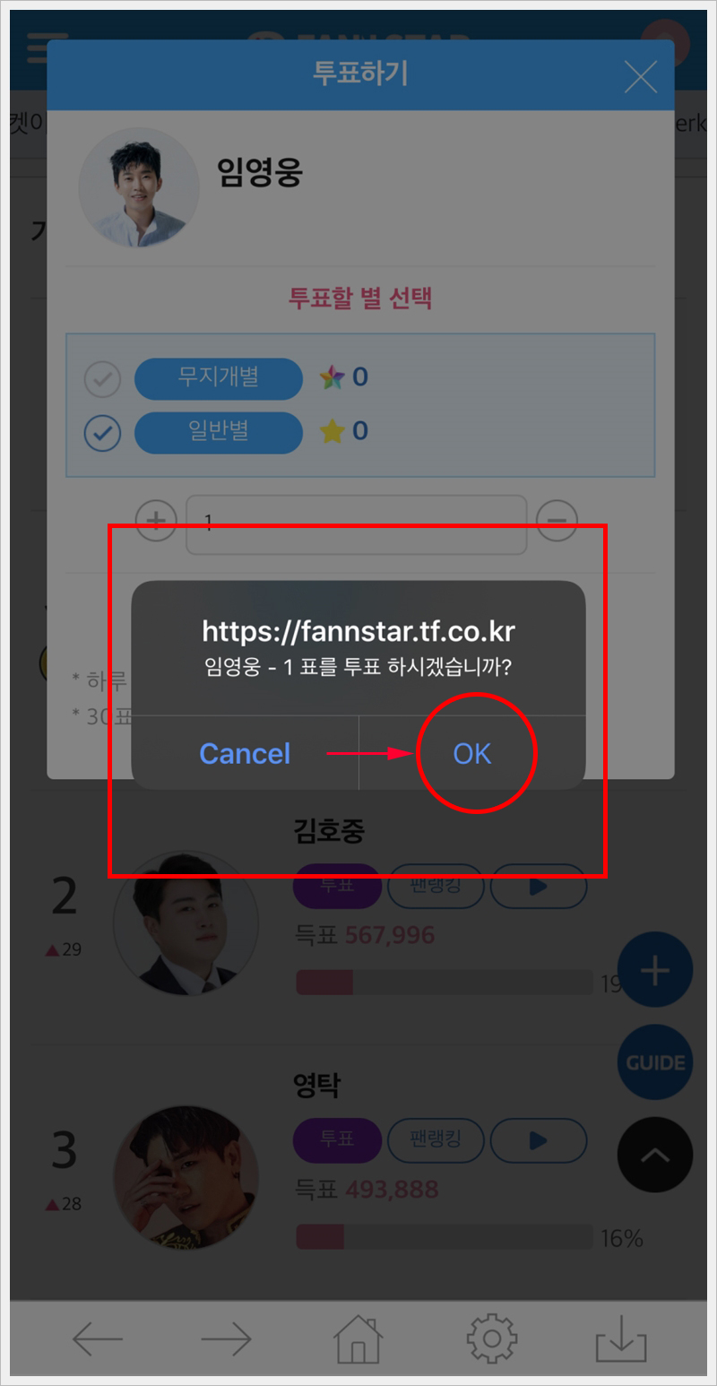 투표로 들어가신 후 투표를 하면 임영웅 - 1 표를 투표하시겠습니까? 나오시면 OK 하시면 투표가 완료됩니다. 비록 1표를 투표하긴 했지만, 무료 충전소에서도 충전이 가능합니다. 하루에 투표할 수 있는 별의 개수는 1,000개가 가능합니다. 아무튼 저도 투표했습니다. 나 하나가 무슨 도움이 되겠어? 가 아닌 나 하나라도 도움이 되자!라고 생각하시면 아주 좋으실 듯합니다.