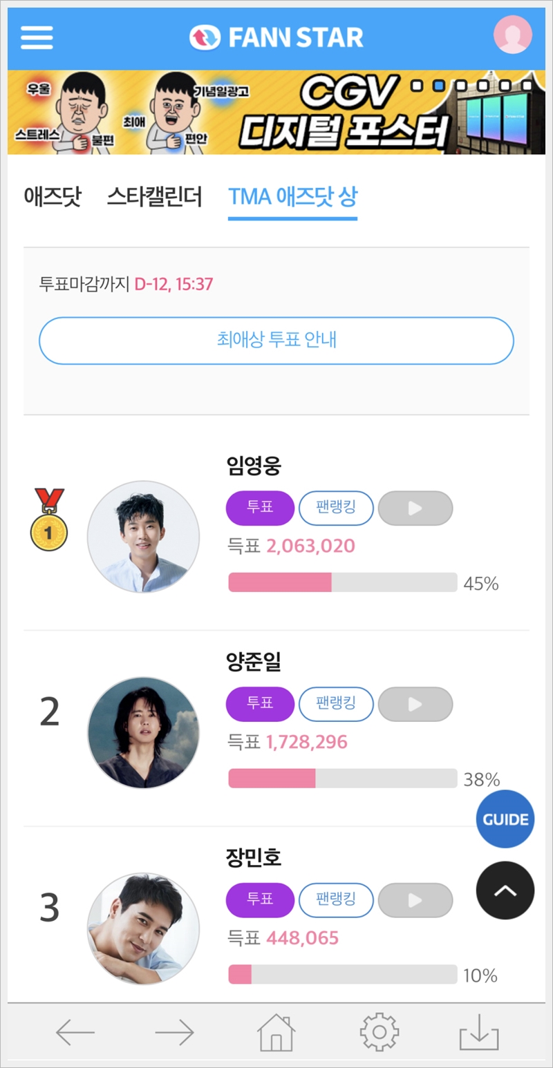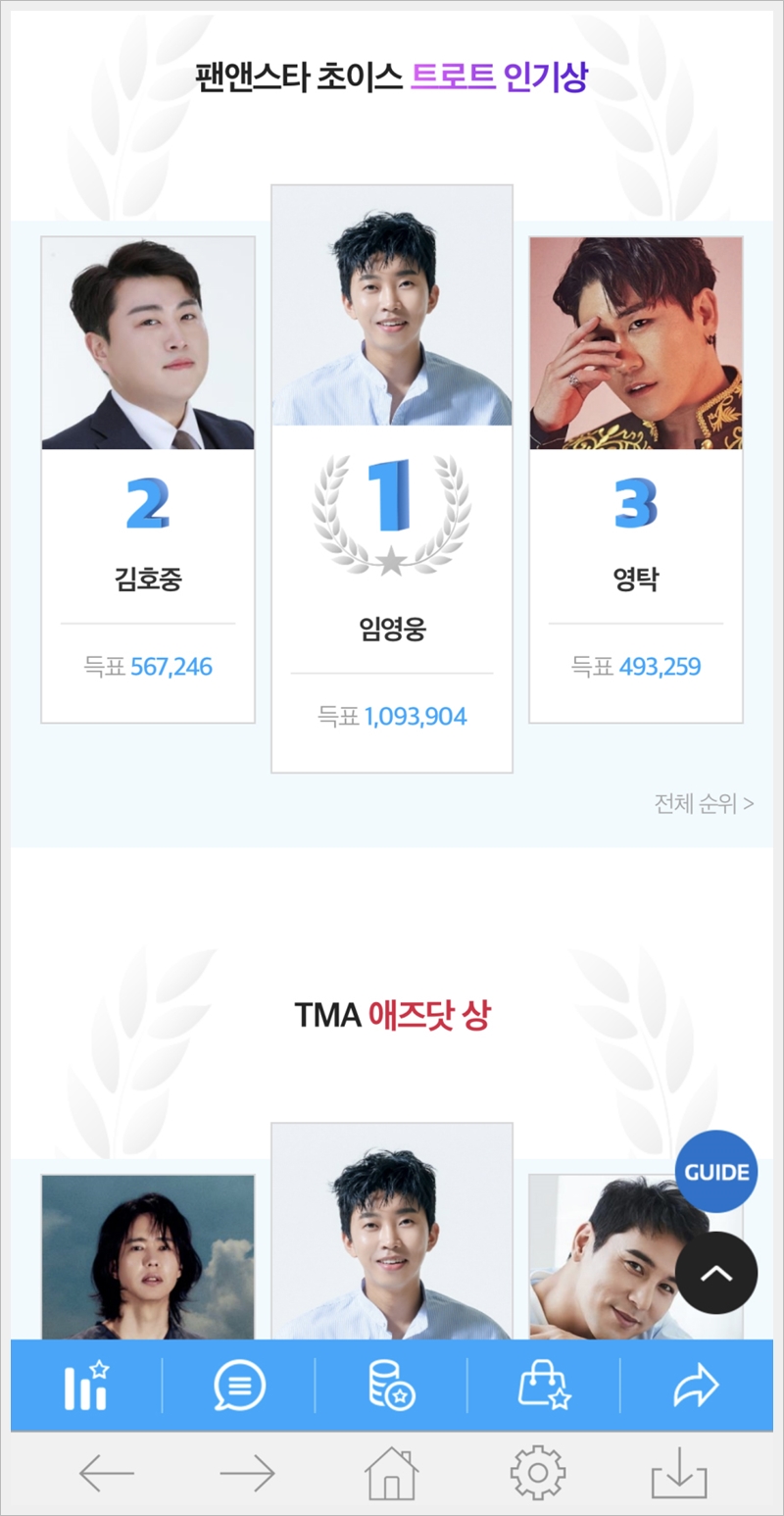 자신의 핸드폰에 팬앤스타를 설치하시면 아래처럼 화면이 나옵니다. 팬앤스타 앱에 들어갔더니, 명예의 전당 임영웅이 딱! 뜹니다. 역시나 멋집니다. 팬앤스타 초이스 트로트 인기상 부문과 TMA 애즈닷 상의 1위는 현재 임영웅입니다. 자 이제부터 투표를 해야 하는데요. 투표를 하기 위해서는 회원가입이 필요합니다. 회원가입이 조금 복잡합니다. 잘 보시고 따라 하셔야 합니다.