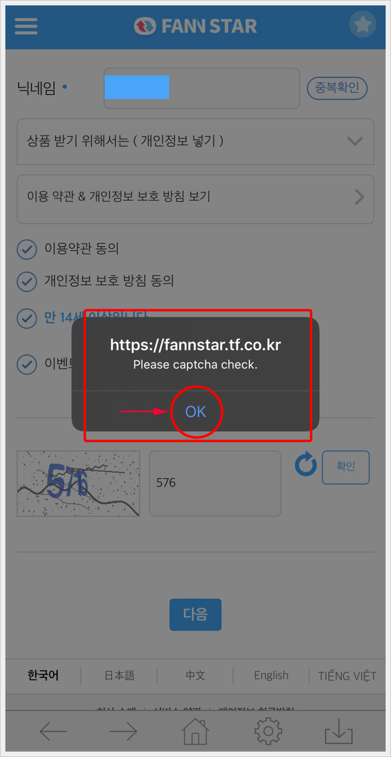 이 부분이 제일 중요합니다. 이 부분에서 가장 많은 에러가 나고, 가장 많이 어렵다고 하는 부분입니다. 이 부분만 넘어가시면 됩니다. 자 왼쪽부터 보시면 위쪽의 YES를 누르면 처음 나타나는 화면입니다. 6️⃣  닉네임은 자신의 별명이니까 자신이 원하는 닉네임 쓰시면 되는데요. 꼭 중복확인을 눌러주셔야 합니다. 그리고 아래 7️⃣ 이용약관 동의, 개인정보 보호 방침 동의, 만 14세 이상입니다. 이벤트, 공지사항 받기(선택) 모두 체크해주시면 됩니다. 그리고 아래 보시면 8️⃣ 왼쪽에 숫자 나오는데요. 그 숫자 그대로 입력하시고 꼭 확인을 눌러주셔야 합니다. 두 번째 에러가 바로 중복확인과, 확인을 눌러주지 않으면 나오는 에러 창입니다. 중복확인 4개 체크하고, 숫자 정확히 입력하면 맨 오른쪽의 successfully vertification 이게 나와야 정상적으로 가입이 되셨다는 이야기입니다. 닉네임 입력 후 중복확인 이용약관 및 4개 동의 그리고 숫자 입력후 확인 꼭 누르셔야 합니다. 저도 여기서 많이 헤매었습니다.