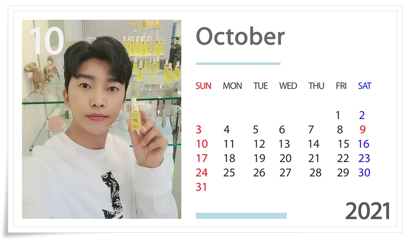 2021년 10월 임영웅 달력 사진은 세럼을 들고 있는 화장품 모델 히어로 입니다. 피부도 무척이나 좋은 히어로 입니다. 파일은 사진 아래에 보시면 10월 이라고 파일이 있습니다.