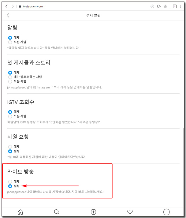 알림 설정에서 자신이 원하시는 것 모두 해제와 설정으로 변경하실 수 있습니다. 해제는 안 하는 것이고, 설정은 한다는 이야기입니다. 라이브 방송의 설정을 설정으로 해주시면, 라이브 방송이 시작되면, 푸시알림으로 자신의 핸드폰에 바로 뜹니다. 그러면 라디오 방송이 시작되었다는 이야기 입니다. 한가지 더 알려드리면,아이폰의 경우 라이브방송 설정만으로 자신의 핸드폰에 알림이 울리지 않는 경우가 있는데요. 그건 아이폰 설정에서 알림 설정에서 인스타그램이 꺼져있기 때문입니다. 정확하게 라이브방송 설정을 했는데도 나오지 않는다면, 아이폰 설정을 한번 보시면 됩니다.