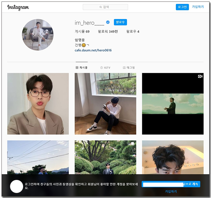 임영웅 공식 인스타그램을 들어가시면 바로 이렇게 im_hero_ 옆에 파란색으로 ✔️ 체크 표시가 되어 있는데요. 이 체크표시가 있어야지만, 공식 인스타그램임을 알려주는 체크라고 생각하시면 됩니다. 임영웅 공식 인스타그램이라는 표시가 바로 파란색 ✔️ 체크 표시가 있는 겁니다. 그 아래 보시면 게시물 69개, 팔로워 349천명 팔로우 4명으로 되어 있습니다. 팔로워는 임영웅을 따르는 사람이라고 보시면 되고요. 팔로우는 임영웅이 따르는 사람이라고 생각하시면 아주 편합니다. 그러니까 349천명은 349,000명이라고 보시면 됩니다. 현재 임염웅이 팔로우를 하고 있는 곳은 총 4곳입니다. 자신의 소속사 인스타그램과 미스터트롯 공식 인스타그램 그리고 축구 인스타그램 2곳입니다. 발리슛도 잘하는 히어로 2곳이 무려 축구 입니다. 곧 35만명이 히어로를 따른다고 생각하시면 될 것 같습니다. 그 아래 임영웅 건행 😋 ㄱ 요렇게 되어 있습니다. 건행. 건강하시고 행복하세요.^^* 임영웅 공식 팬카페 주소가 나와 있습니다. 이곳입니다. 임영웅 공식 인스타그램 바로가기는 아래 링크를 따라서 들어가시면 됩니다.