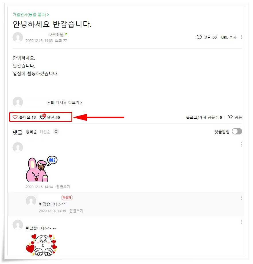 카페에는 회원등급이라는것이 있습니다. 일단 카페에 가입을 하면 새싹회원이 됩니다. 일반회원 등급이 되어야지만, 모든 게시판의 글을 읽을수 있고, 또한 글쓰기도 가능합니다. 아래에서 일반회원 되는 방법 자세하게 알려드리도록 하겠습니다. 우선 일반회원이 되시려면 게시글수 3개와 댓글수 10개, 출석수 20회가 되어야지만 회원등업조건에 만족을 합니다. 단 가입후 1주후 만족 시에 자동등업이 됩니다. 일단 저는 게시글수 2개와 댓글수 10개는 이미 채웠습니다. 출석수 20회는 매일 들어와보면 되고요. 30분에 한번씩 다시 들어오면 출석수 20회는 금방 채울것 같습니다. 단, 일주일의 시간이 걸릴 뿐입니다.