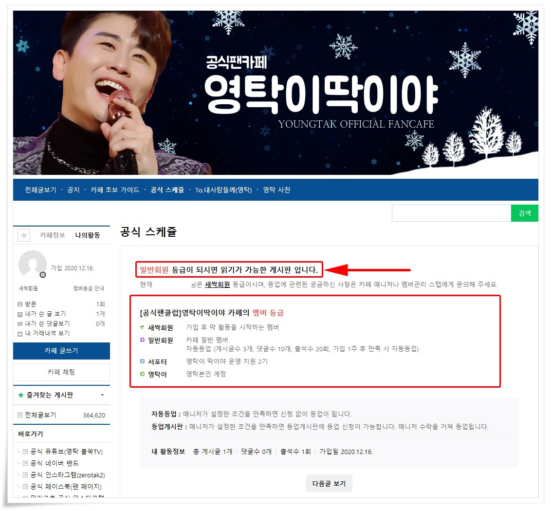 영탁이딱이야 일반회원이 되어야지만, 영탁 스케줄을 보실수 있습니다. 왼쪽 카테고리에 보시면, 영탁 공식 스케줄 카테고리가 있는데요. 그곳으로 들어가시면 영탁의 12월 스케줄표를 보실수 있습니다. 단, 일반회원에게만 그 스케줄이 공개가 됩니다. 일반회원이 되어야 하는 이유입니다.