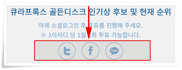 위쪽에 보시면 이렇게 생긴 이미지가 있는데요. 아래 소셜로그인 후 투표를 진행해 주세요. 1아이디 당 1일 1회 투표 가능합니다. 자신이 사용하고 있는 트위터, 페이스북, 카카오톡중에 하나 선택하시면 됩니다.