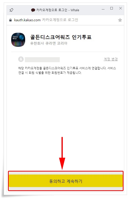 저는 카카오톡을 선택했고요. 일단 로그인 먼저하면, 골든디스크어워즈 인기투표 동의하고 계속하기 하시면 됩니다. 이러면 SNS와 연동이 모두 끝난겁니다. 그럼 다시 투표를 진행하시면 됩니다. 자동으로 로그인 됩니다. 다시 히어로를 선택하고, 투표하기를 눌렀습니다.