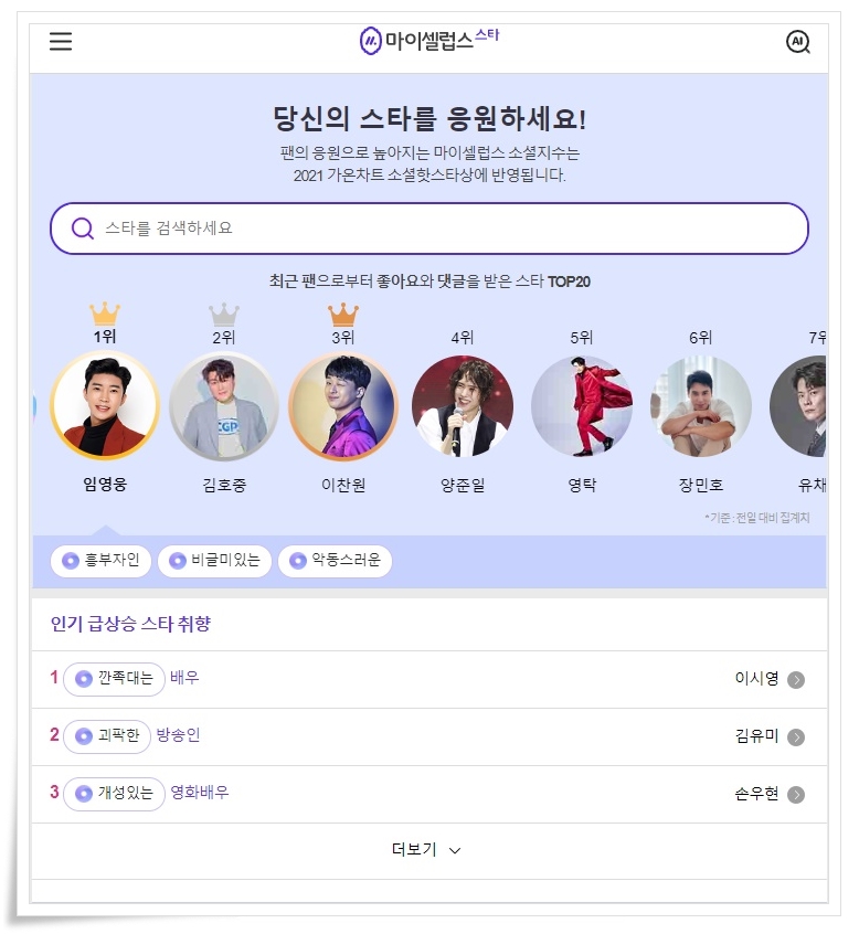 최근 팬으로부터 좋아요와 댓글을 받은 스타 TOP20에 1위 임염웅이 등록되어 있습니다. 마이셀럽스 스타에서 당당히 1위를 차지하였습니다. 정말이지 히어로 너무 멋집니다.