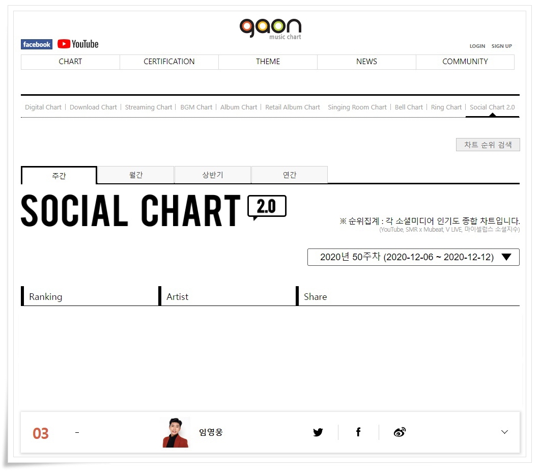 현재 가온차트의 가온소셜차트 2.0의 주간 순위는 임영웅이 3위 입니다. 2020년 50주차 주간순위 집계 입니다. 정말이지 우리의 히어로 너무나 멋집니다.
