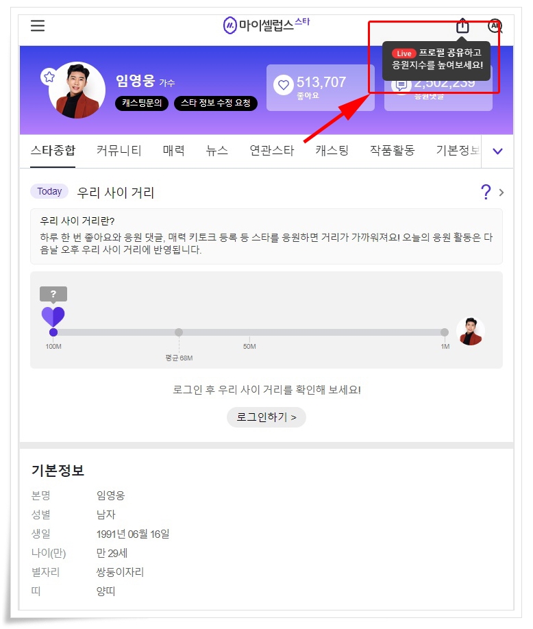 우선 마이셀럽스 스타 홈페이지로 들어가시면 가장 먼저 주목하셔야 할 부분이 우측 상단에 보시면 프로필 공유하고 응원지수를 높여보세요! 가 있습니다. 이걸 진행하려면 로그인이 필요합니다. 회원가입을 먼저 진행하셔야 합니다.