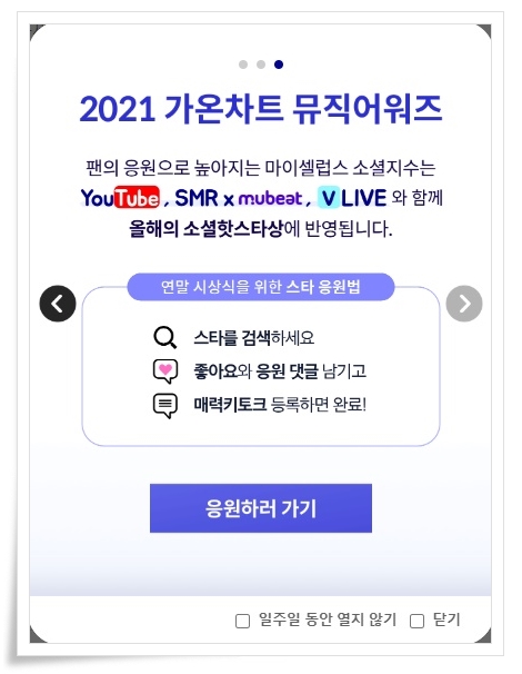 위에서도 말씀드렸지만, 마이셀럽스 스타 홈페이지로 들어가시는걸 추천드립니다. 홈페이지로 접속하시면 아래처럼 팝업창이 가장 먼저 뜹니다. 2021 가온차트 뮤직어워즈 팬의 응원으로 높아지는 마이셀럽스 소셜지수는 유튜브, SMR, mubeat, V LIVE와 함께 올해의 소셜핫스타상에 반영됩니다. 스타를 응원하시려면 1번 스타를 검색하세요. 2번 좋아요와 응원댓글 남기고 3번. 매력키토크를 등록하면 완료합니다. 아래에서 이미지 보시면서 천천히 따라해 보시길요.
