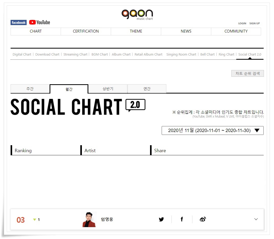 가온소셜차트 2020년 11월 월간 순위는 임영웅이 현재 3위 입니다. 12월에는 몇위를 할지가 벌써부터 궁금해집니다.