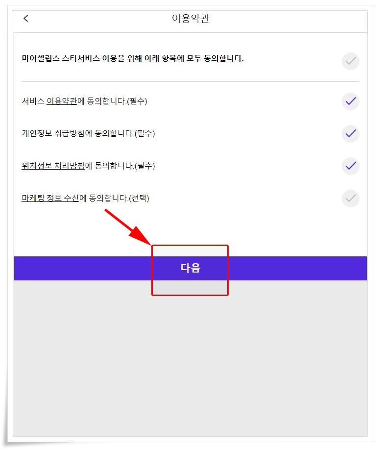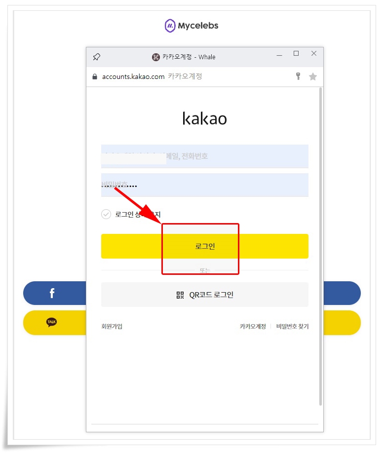 카카오톡으로 로그인 하시면 자신의 카카오 아이디와 비밀번호 입력하신후, 로그인 누르시면 아래 가운데 마이셀럽스 전체동의하기 체크하신후 동의하고 계속하기 누르시면 됩니다. 아래 맨 오른쪽 이용약관에 동의하기 하신후 다음 누르시면 회원가입이 모두 끝난 겁니다. 카카오톡으로 마이셀럽스에 로그인 하신거라고 생각하시면 됩니다. 페이스북 아이디 가지고 계신분들은 페이스북으로 진행하셔도 동일합니다.
