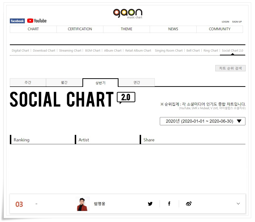 2020년 상반기 가온소셜차트 2.0의 순위는 임영웅이 3위 입니다. 우리나라 전체 가수들중에서 상반기 3위를 차지한 임영웅 입니다.