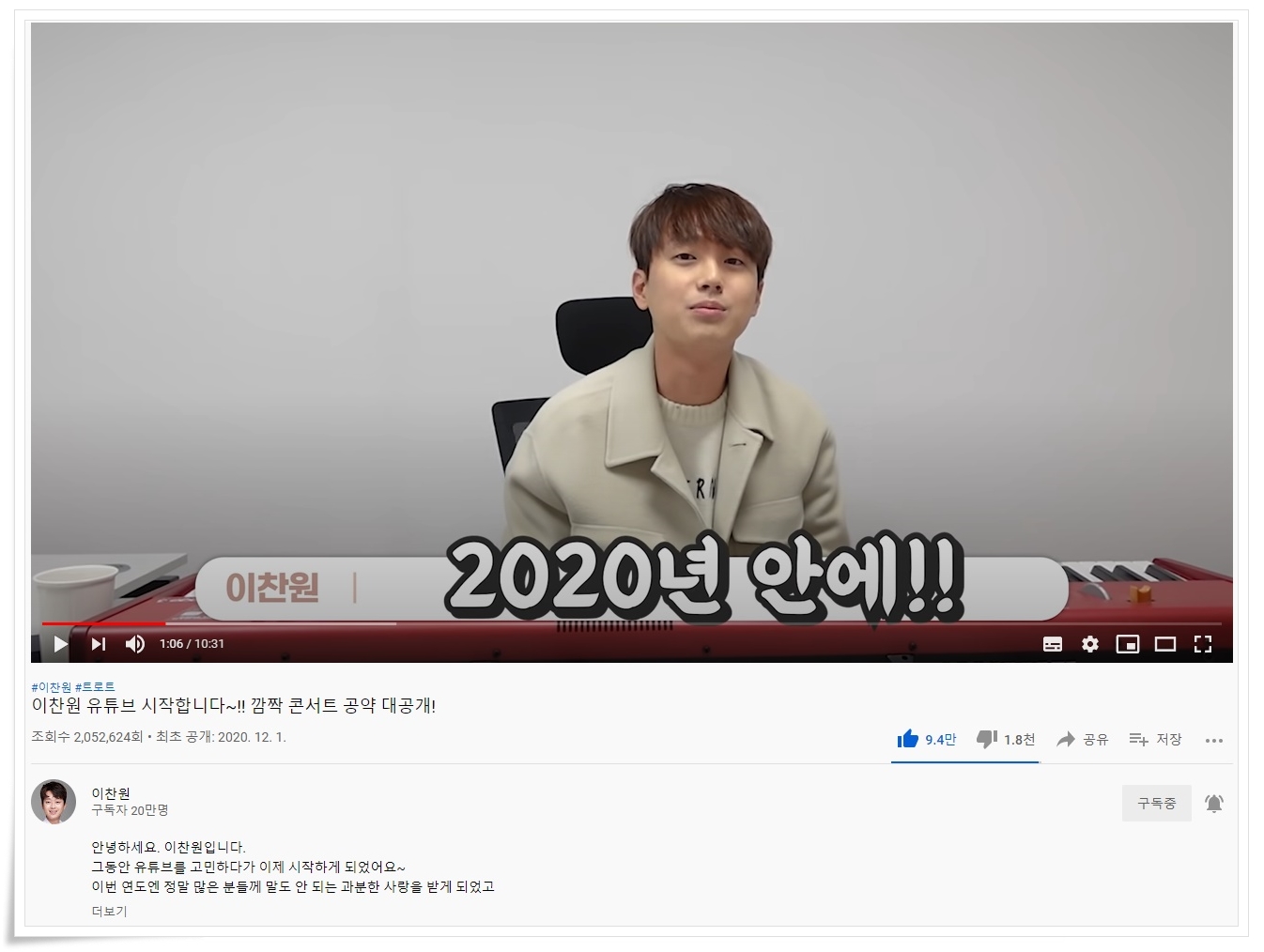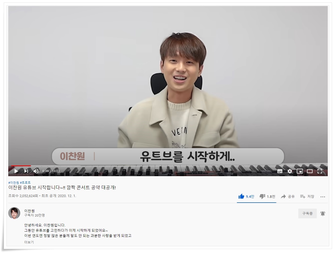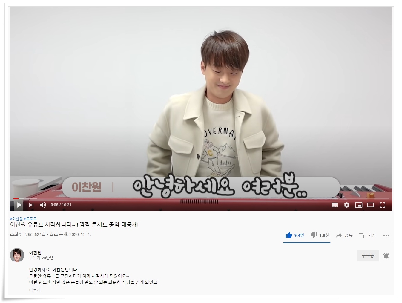아마도 찬또배기는 연말이 지나기 전에 유튜브 라이브 방송을 한번 할것도 같습니다. 비록 이제 5일이 남긴 했지만, 이미 찬또배기 이찬원 유튜브 공식 채널의 구독자는 20만이 넘었습니다. 20만이 얼마나 큰 숫자냐고요? 우리나라에 그렇게 많은 유튜버들이 존재한다고는 하지만 10만이 넘는 유튜브는 2020년 8월까지 10만명이 넘는 유튜버는 우리나라에 3,800명만이 존재한다고 합니다. 아마 주위에서 유튜버 하시는 분들 정말 많으실텐데요. 10만 넘는 구독자를 가진 유튜버는 3,800명만이 존재한다고 합니다. 그러니까 불과 한달만에 20만 구독자라는 숫자는 정말이지 엄청난 숫자입니다. 아마도 조만간 30만은 무난히 넘을것 같습니다. 그의 미니콘서트, 팬미팅을 보시려면 지금 바로 구독 신청만이라도 하시길 부탁드립니다.