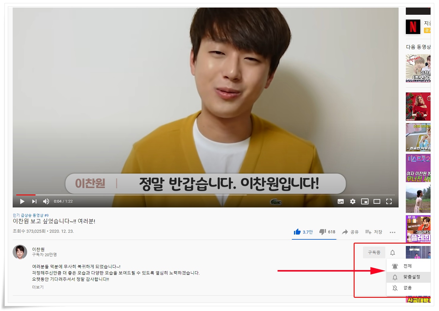 이찬원 유튜브 구독, 좋아요, 알림설정 방법 알려드립니다.