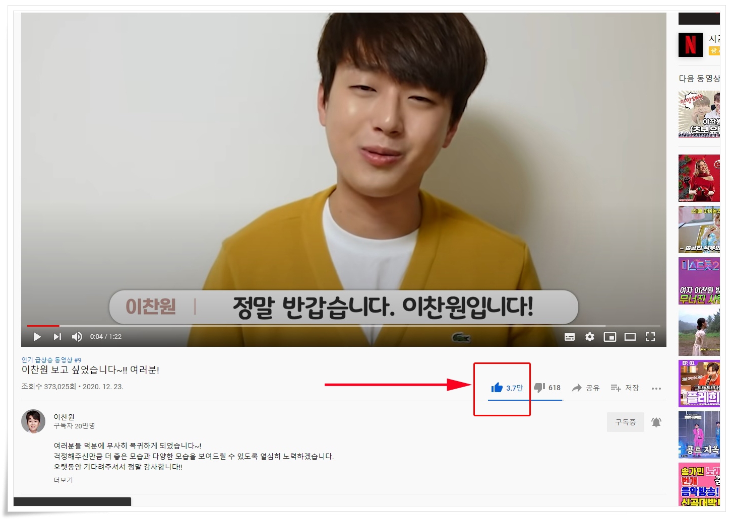 좋아요! 하는 방법은 그의 동영상으로 들어가시면, 오른쪽 아래 보시면 엄지 손가락 이미지 보이시지요. 그걸 누르시면 좋아요! 가 늘어나는 겁니다. 2020년 12월 23일 올린 그의 동영상 좋아요는 3.7만이 넘어갔습니다. 좋지 않아요 618은 몰까요? 정말 이해되지 않습니다. 아무튼 좋아요! 숫자가 많을수록 그의 영상이 인기가 좋다는 이야기가 됩니다. 댓글 또한 마찬가지고요. 구독자수 또한 마찬가지입니다. 그의 동영상이 인기가 많아질려면 이 모든게 같이 함께 가야 합니다. 그래서 이 세상 모든 유튜버들이 구독, 좋아요 알람설정이라는 말을 달고 사는 겁니다.