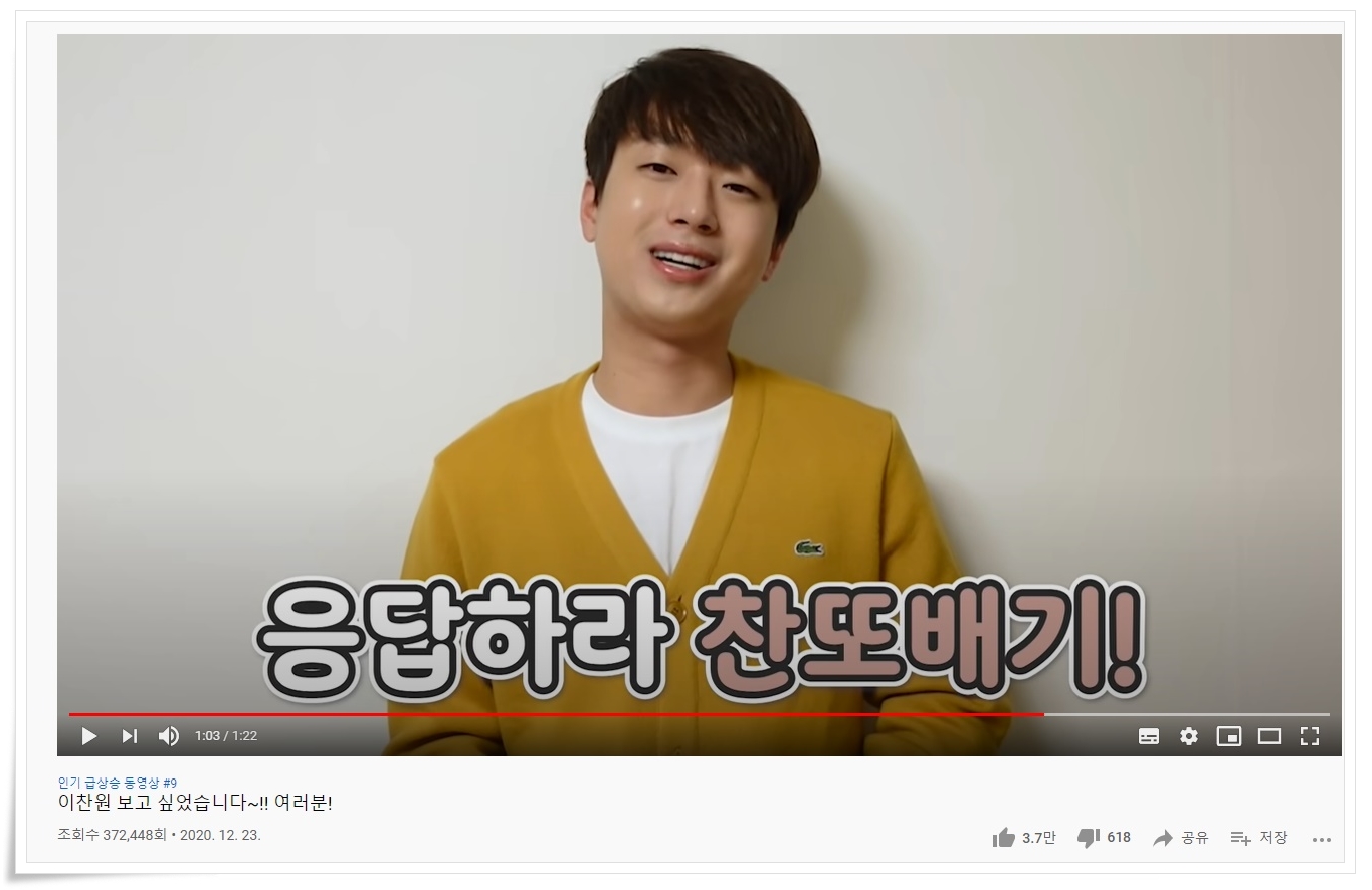 이찬원 유튜브 공식 채널 구독, 좋아요, 알람설정, 그리고 댓글까지.