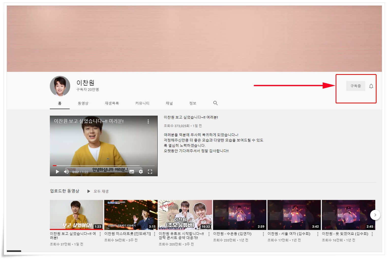이찬원 유튜브 공식 채널로 들어가셨다면, 아마도 상단 오른쪽에 보시면 빨간색으로 구독 버튼이 있을 겁니다. 그 구독버튼을 누르시면, 구독중으로 바뀝니다. 그러면 당신은 이찬원의 유튜브 공식 채널 구독자가 된것입니다. 구독자수가 많아질수록 당연히 좋은 겁니다. 구독하는 방법 어렵지 않습니다. 단, 유튜브 회원가입이 되어 있어야 가능합니다. 유튜브 회원가입은 youtube.com에서 가능하며, 구글 아이디가 계시다면 바로 연동이 가능합니다. 아마도 모두들 가지고 계실거라고 생각하고 회원가입은 여기까지만 하겠습니다.