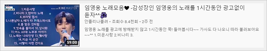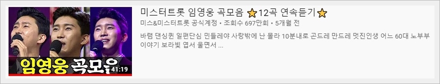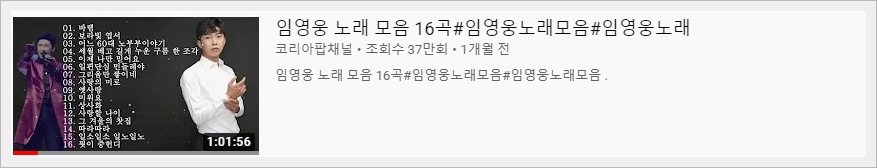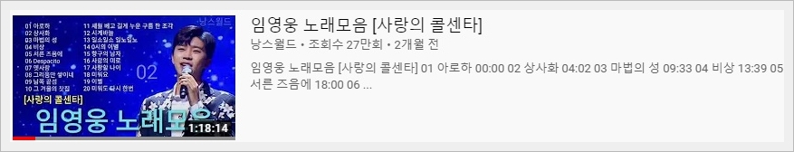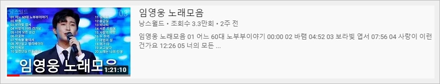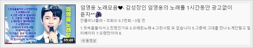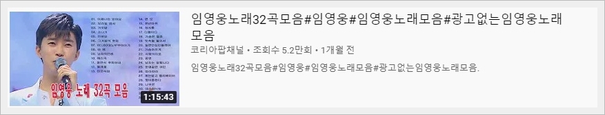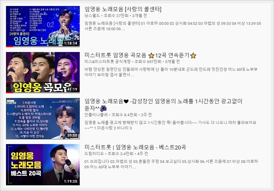 우선 유튜브로 들어가셔서 임영웅 노래모음을 검색해 보세요. 정말이지 수많은 히어로의 노래를 모두 들으실수 있습니다. 단, 핸드폰에서 노래를 연속으로 들으시려면 데이터가 소진되기 때문에 데이터 무제한이 아니신 분들은 제약이 따를수 밖에 없습니다. 그럴때에 이렇게 자신의 컴퓨터에 다운로드 또는 핸드폰에 다운로드 해 놓으시면 데이터에 상관없이 무제한으로 히어로의 노래를 감상하실수 있습니다.