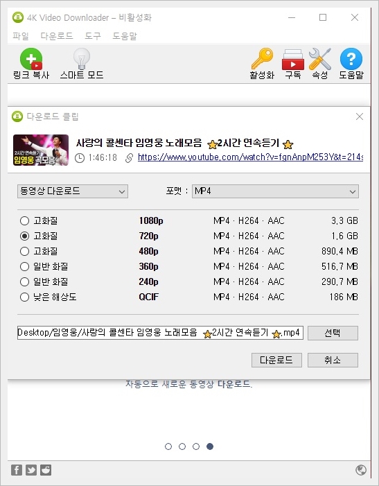 일단 유튜브 주소만 복사 해 놓으신 다음 위에서 알려드린 4K Video Downloader 프로그램으로 들어가시면 바로 동영상 다운로드가 뜹니다. 이미 주소를 복사해놓았기 때문에 아무것도 하지 않아도 바로 동영상 다운로드가 뜹니다. 여기서 설정해주셔야 할건 자신이 원하는 폴더 경로만 지정하시면 됩니다. 또 하나 주의하셔야 할것이 가장 큰 고화질로 다운로드를 받으시면 가장 좋습니다만, 단 카카오톡으로 전송을 하신다면 300M를 넘으시면 안됩니다. 왜 그런지는 아래에서 이미지로 자세하게 설명해 드리겠습니다.