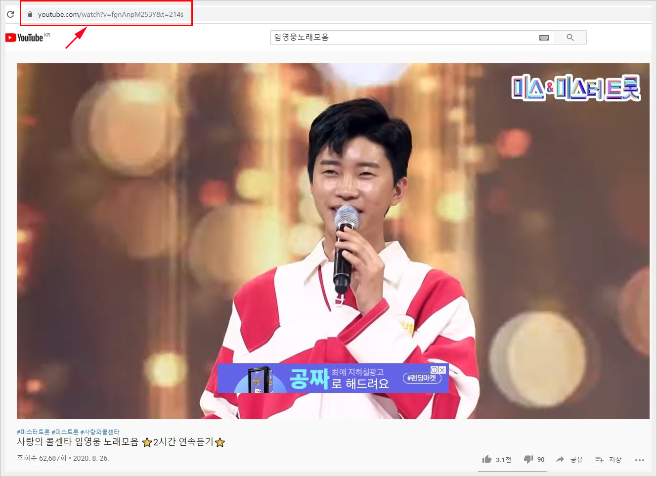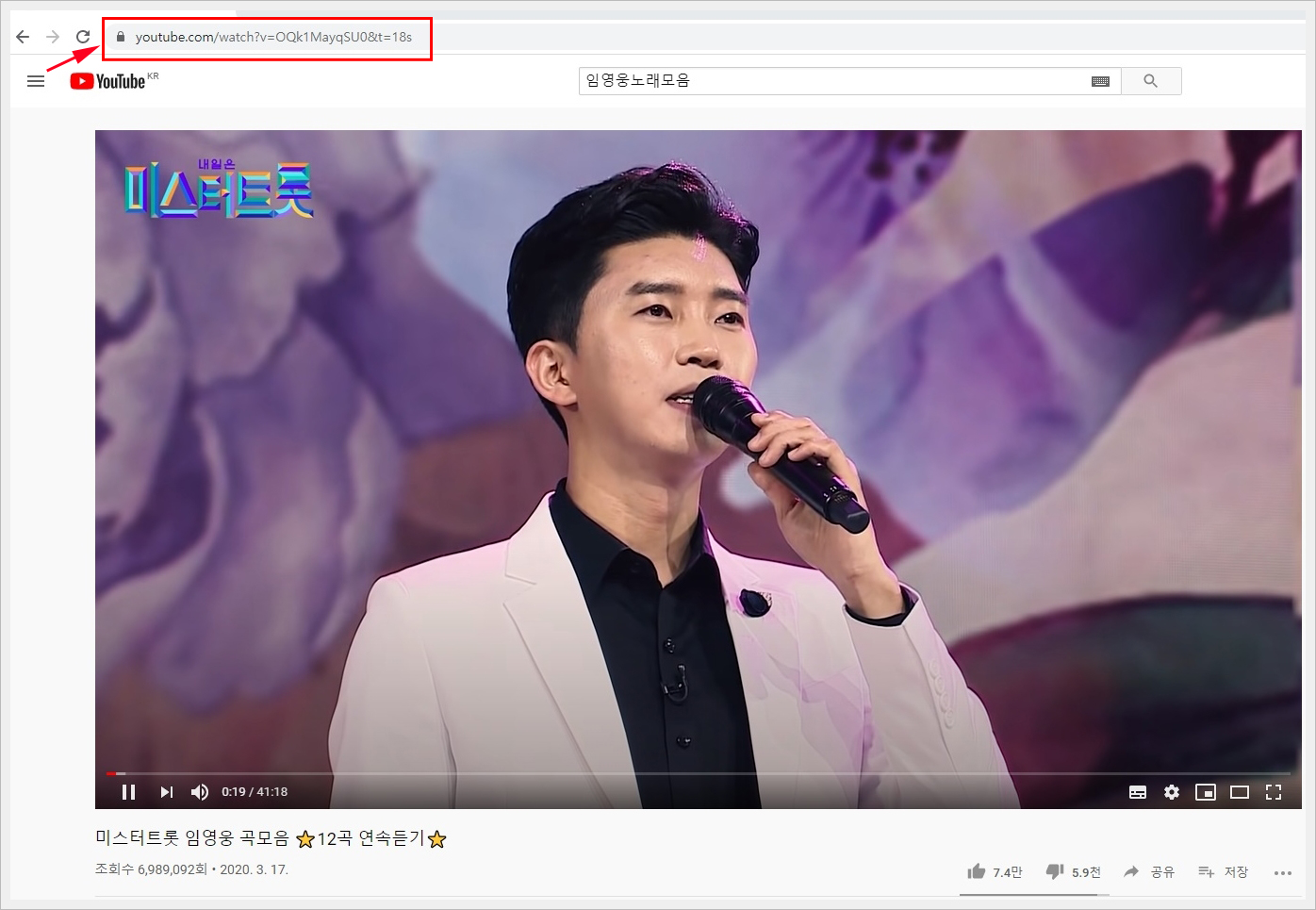 일단 자신이 가장 듣고 싶은 임영웅 노래모음 유트브로 일단 들어가 줍니다. 다음 저기 위에 보시면 유튜브의 주소 보이시지요. 이 주소만 복사하시면 됩니다. 다른거 하나도 없습니다. 주소 복사만 하시면 끝입니다.