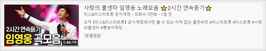 컴퓨터로 접속하시는 분들은 굳이 데이터를 신경쓰시지 않으셔도 되기 때문에 이 공간에서 바로 유튜브 링크로 들어가시면 임영웅 노래모음을 연속으로 들으실수 있습니다. 요즘은 대부분 4K 화질로 나오기 때문에 컴퓨터에서도 생생한 고화질을 즐기실수 있습니다. 컴퓨터로도 무한 반복 가능합니다. 아래에 바로가기 링크들 많이 올려놓겠습니다. 많이들 즐기셨으면 좋겠습니다.