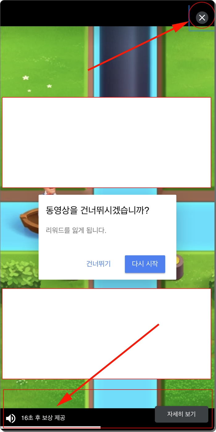 광고의 형태에 따라서 중간에 X 표시가 나오는 경우가 있고, 나오지 않는 경우가 있는데요. 기존의 광고 형식에서는 Skip이라는 광고 건너띄기 기능이 있었는데요. 지금은 그 기능이 사라졌습니다. 광고를 모두 시청하기전 X를 누르면 오른쪽 아래처럼 동영상을 건너뛰시겠습니까? 창이 나오는데요. 이건 처음으로 다시 돌아가는것과 마찬가지입니다. 그러니까 그냥 광고 끝날때까지 시청하시면 됩니다. 광고가 길어봤자 20초 내외입니다. 그냥 잠시 눈깜빡하면 사라지는 정도입니다. 그냥 맘편히 광고 나오게 두시면 됩니다.