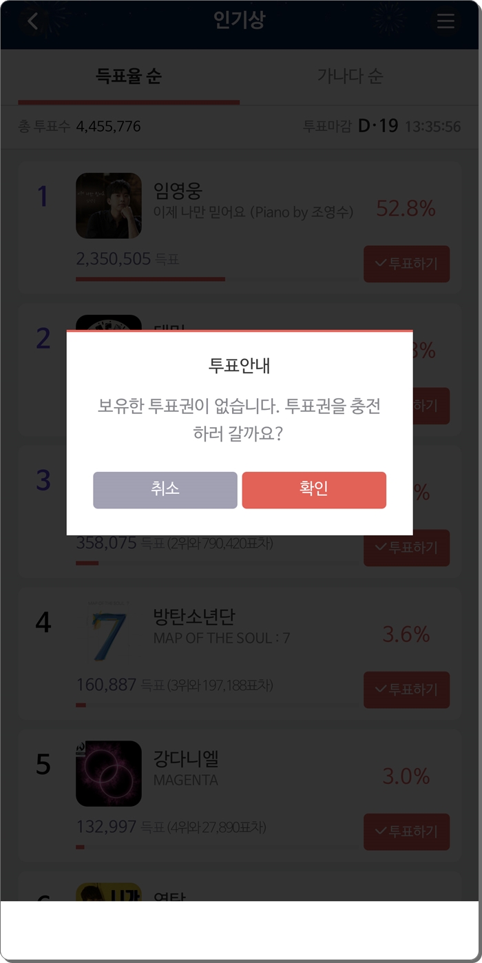 자신의 핸드폰에 설치된 서울가요대상 공식투표앱에 접속하시면 투표를 진행하실수 있습니다. 본상, 신인상, 인기상, 트로트상 투표를 진행할수 있습니다. 인기상과 트로트상 1위는 현재 히어로 입니다. 1위를 유지하기 위해서는 남은 19일동안 열심히 투표를 진행하셔야 합니다. 인기상으로 들어가시면 투표를 진행할수 있습니다. 현재 1위는 임영웅으로 2,350,505표 입니다. 저도 여기에 아주 작게나마 한몫했습니다. 아무튼 그렇게 들어가셔서 투표를 진행하면 되는데요. 일단 투표권이 있어야 합니다.