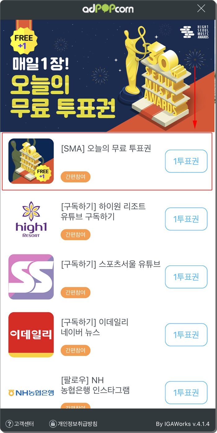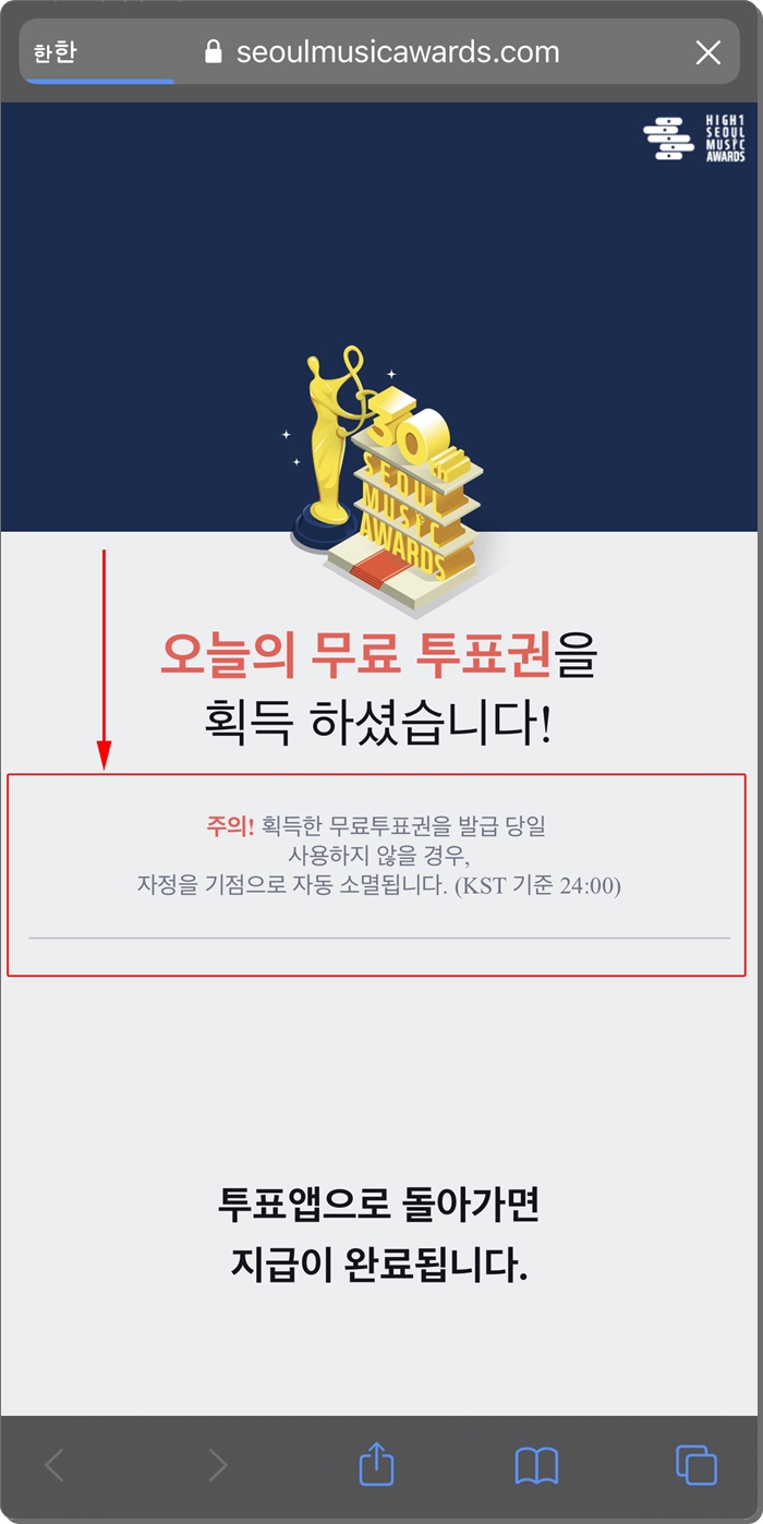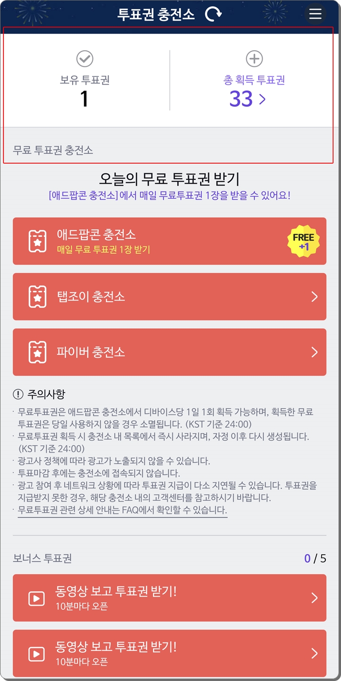 ※ 여기서 주의사항 하나 알려드립니다. 획득한 무료투표권 발급 당일 사용하지 않으면, 투표권이 사라져 버립니다. 무료 투표권의 유효기간은 하루 입니다. 하루안에 투표를 진행하셔야 합니다. 무료 투표권은 쌓이는것이 아니라, 하루에 한번 투표를 진행할수 있는 겁니다.