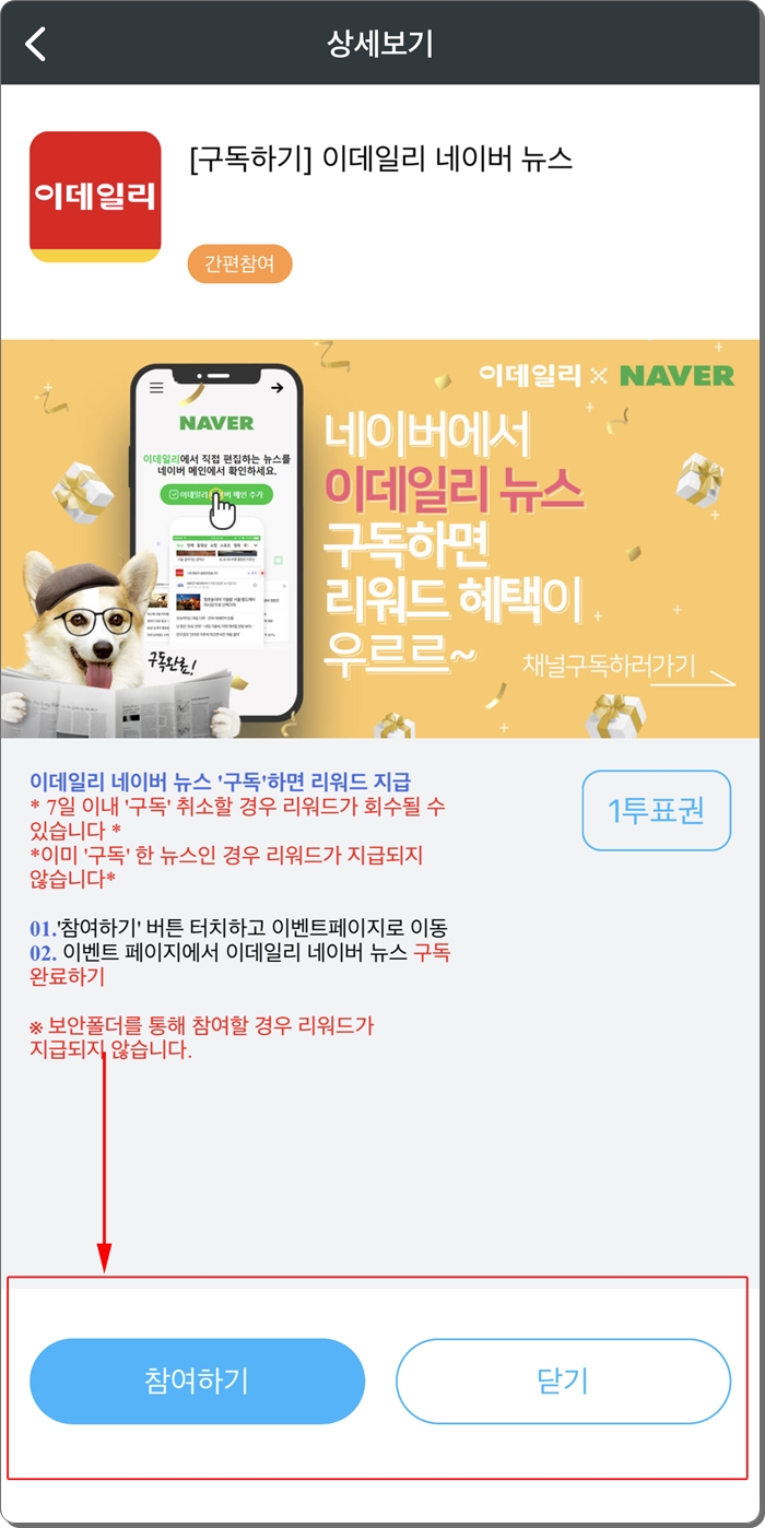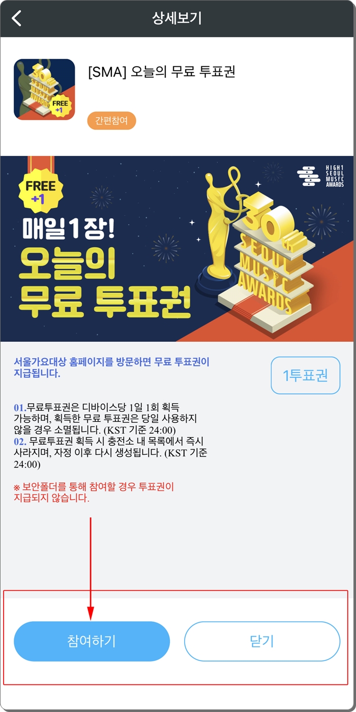 오늘의 무료 투표권으로 들어가신후 아래 왼쪽 버튼 참여하기를 누르시면 바로 투표권 하나를 획득하실수 있습니다. 새로운 팝업창이 열리는 형태라서 오른쪽 상단 위 X 를 누르시면 기존의 앱으로 이동합니다. 혹시나 해서, 다른 무료 투표권을 얻을수 있을까 해서 한번 더 해봤는데요. 더이상 진행되지 않습니다. 그러니까 하루에 하나만 무료 투표권을 획득하실수 있습니다.