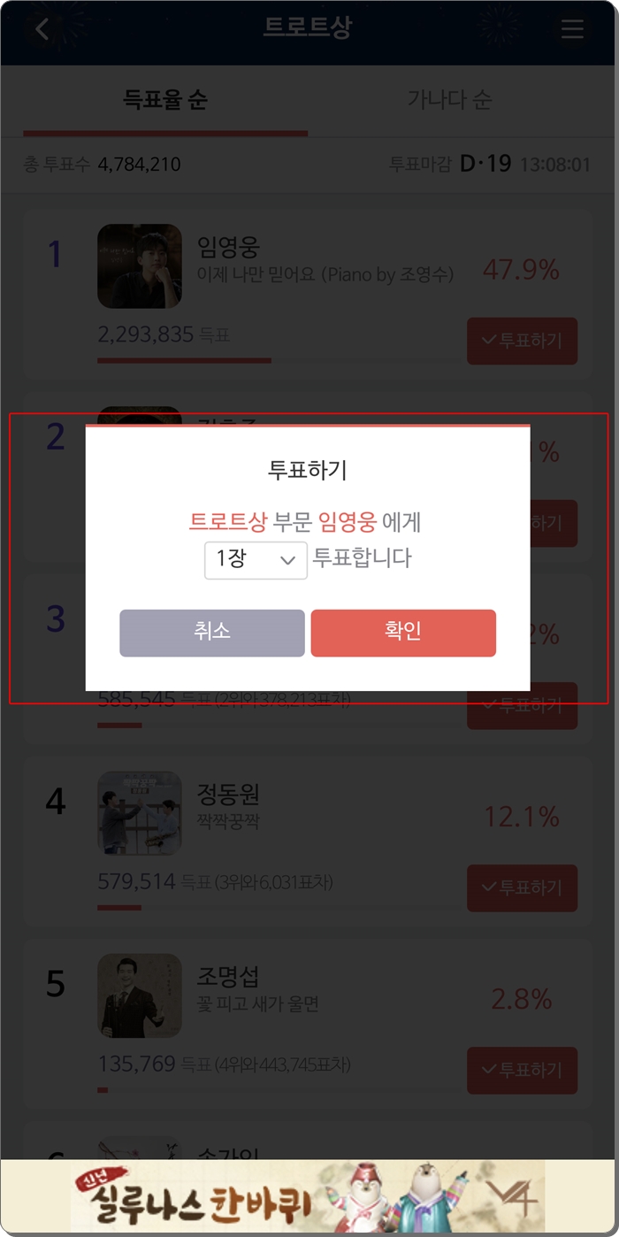 광고 5회를 시청하면 또 하나의 투표권이 생성됩니다. 그러면 투표를 하시면 됩니다. 트로트상 부문 임영웅에게 1표를 투표 진행하시면 되는 겁니다. 위에서도 말씀드렸지만, 확인을 꼭 누르셔야 합니다. 그래야지만, 투표완료 창이 뜹니다. 정확하게 투표를 진행하신 겁니다.