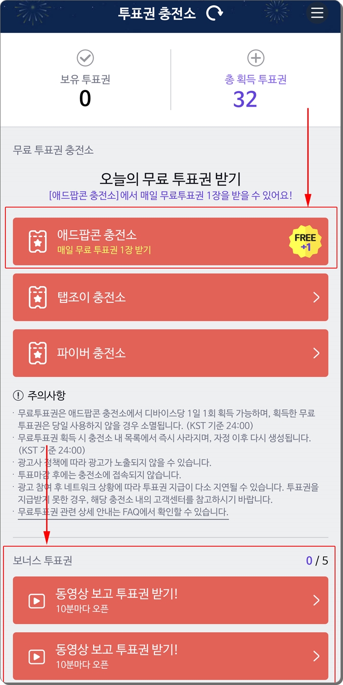 투표권을 받는 방법은 2가지가 존재합니다. 오늘의 무료 투표권 받기에서 애드팝콘 충전소를 이용하는 방법과 보너스 투표권 동영상 보고 투표권 받기가 존재합니다. 오늘의 무료 투표권 받기에서 제일 위 애드팝콘 충전소만 무료 투표권을 얻을수 있습니다. 그러니까 제일 위 애드팝콘 충전소만 이용하시기를 권해드립니다. 나머지는 유료로 투표권을 구매하는거라고 보시면 됩니다. 오늘의 무료 투표권으로 들어가시면 1투표권이라고 쓰여있는 이미지로 들어가시면 됩니다.