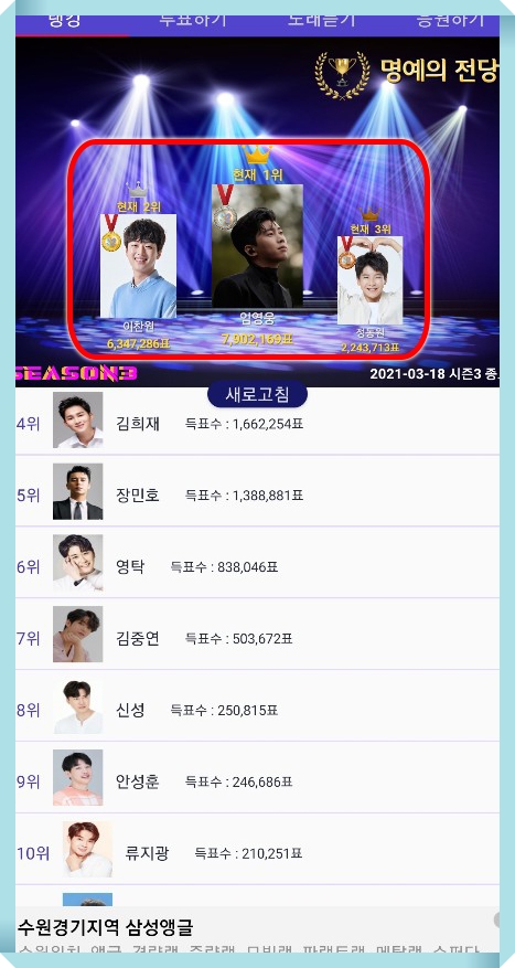 저의 투표권은 현재 8장이 있습니다. 아래에 보면 투표권이 늘어날텐데요. 그것 또한 아래에서 아주 자세하게 알려드리도록 하겠습니다. 아무튼 임영웅으로 들어가시면 임영웅 님에게 투표하시겠습니까? 라고 팝업창이 하나 뜹니다. 네! 를 누르시면 투표가 끝나는 겁니다. 투표하기는 아주 쉽습니다. 현재 우리의 히어로 득표수는 7,902,169회 입니다. 곧 1,000만표 나올것 같습니다. 히어로 사진 이번 새 앨범에 나왔던 사진입니다. 참 멋진 우리의 히어로 입니다. 현재 랭킹 1위 입니다. 이번이 시즌3 입니다.