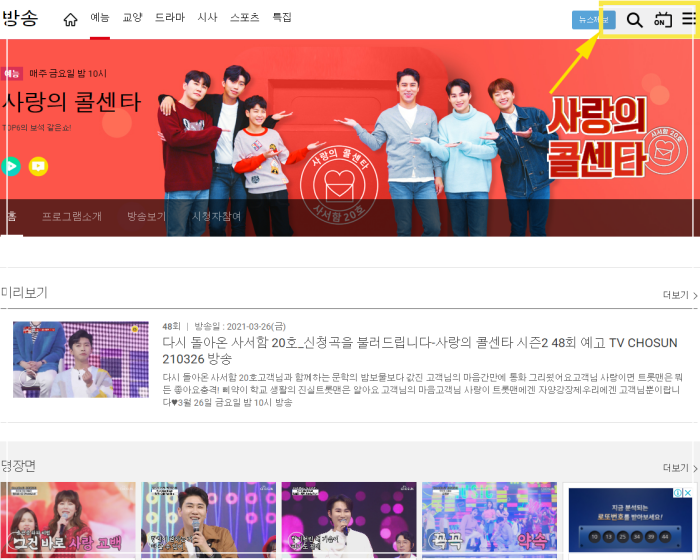TV조선 메인 홈페이지에 들어가시면 방송, 뉴스, VOD메뉴가 상단에 있습니다. VOD메뉴로 들어가셔도 사랑의 콜센터를 시청하실수 있습니다. 물론 인터넷이나 핸드폰에서는 유료로 시청이 가능합니다. 무료 재방송을 보시려면 위에 알려드린 tv편성표를 이용하셔서 그 시간에 tv로 시청시 무료 재방송이 가능합니다.