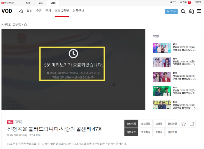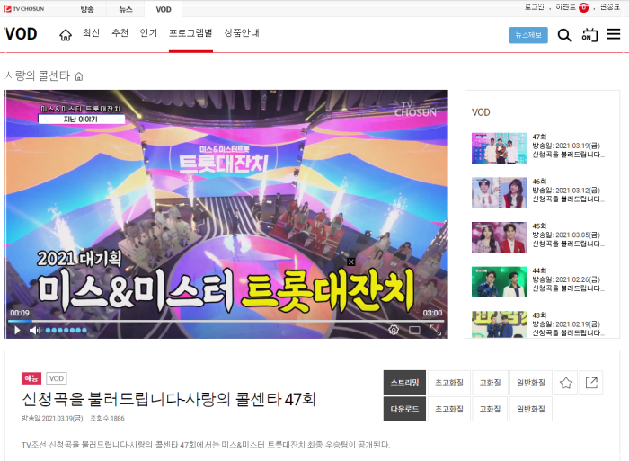 2021 대기획 미스&미스터 트롯대잔치의 47회 방송은 3분까지만 무료로 시청하실수 있습니다.