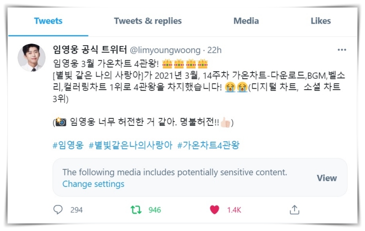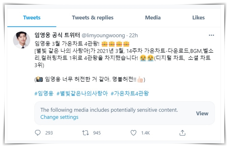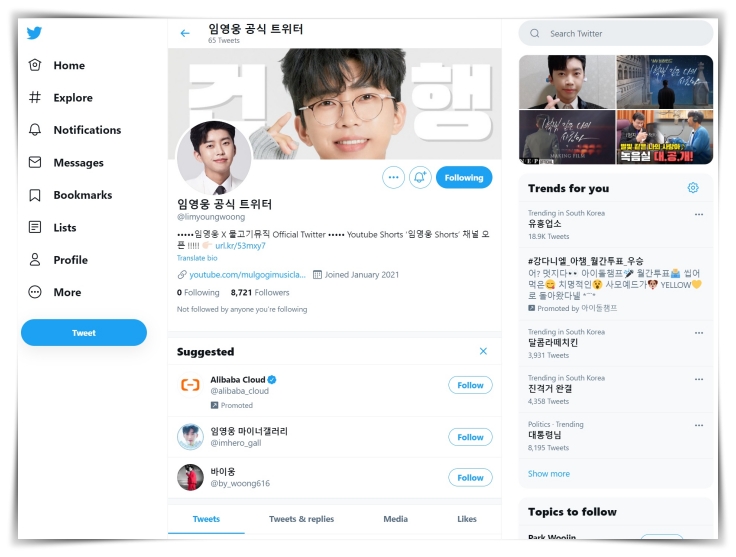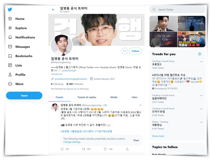 임영웅 공식 트위터 주소는 twitter.com/limyoungwoong 입니다. 이곳으로 들어가셔야지만 공식 계정으로 접속하실수 있습니다. 약 9천명의 팔로워를 확보한 임영웅 공식 트위터의 트위터 입니다. 현재 100개 정도의 트윗이 존재합니다. 실시간으로 소식이 올라옵니다. 3월 가온차트 4관왕 차지한 소식도 바로 올라와 있고요. 얼마전 다쳤던 우리의 히어로가 건강하다는 말도 올라와 있습니다. 무척이나 실시간으로 트윗 즉 글이 올라옵니다.